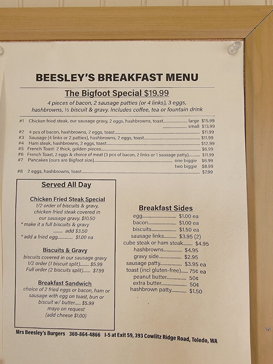 Introducing Mrs. Beesley's Burgers, where hearty meals meet genuine hospitality. Nestled in Toledo, WA, this local gem has become a favorite for burger enthusiasts. The menu features mouthwatering burgers crafted with high-quality ingredients and paired with homemade sauces that elevate each bite. Customer reviews consistently highlight the incredible flavors and generous portions, making every visit worthwhile.